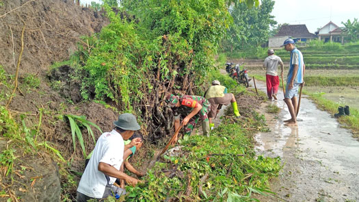 Magetan – Babinsa Koramil Tipe B 0804/12 Lembeyan Jajaran Kodim 0804/Magetan Sertu Sumadi bersama masyarakat, melaksanakan kerja bakti (gotong royong) membersihkan material longsor yang menimbun Saluran Irigasi ke persawahan warga desa Kediren kec lembeyan, selasa (15/3/2022)