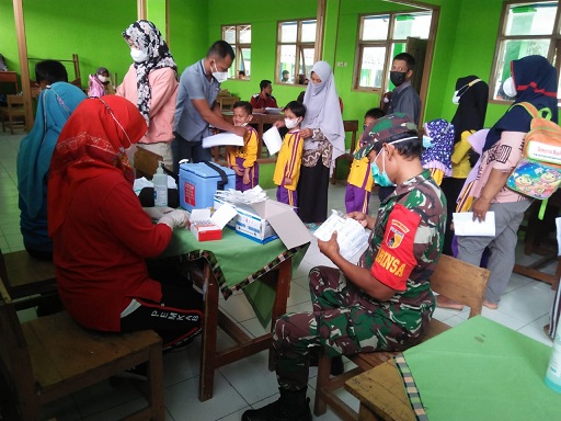 Magetan. Guna mensukseskan program vaksinasi khususnya bagi anak usia 6-11 Tahun di wilayah binaanya, Babinsa Koramil Tipe B 0804/13 Bendo Sertu Jayadi terus bersinergi mengawal pelaksanaan vaksinasi Covid 19 tahap 1 dan 2 kepada anak sekolah di SDN dan MI Desa Setren Kecamatan Bendo Kabupaten Magetan. Sabtu (12/03/2022)