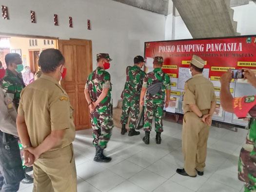Magetan – Komandan Koramil Tipe B 0804/01 Magetan Kodim 0804 Magetan Kapten Caj Jemani mendampingi team penilai lomba kampung Pancasila di kelurahan Mangkujayan kecamatan Magetan kabupaten Magetan, Selasa (15/03/2022).
