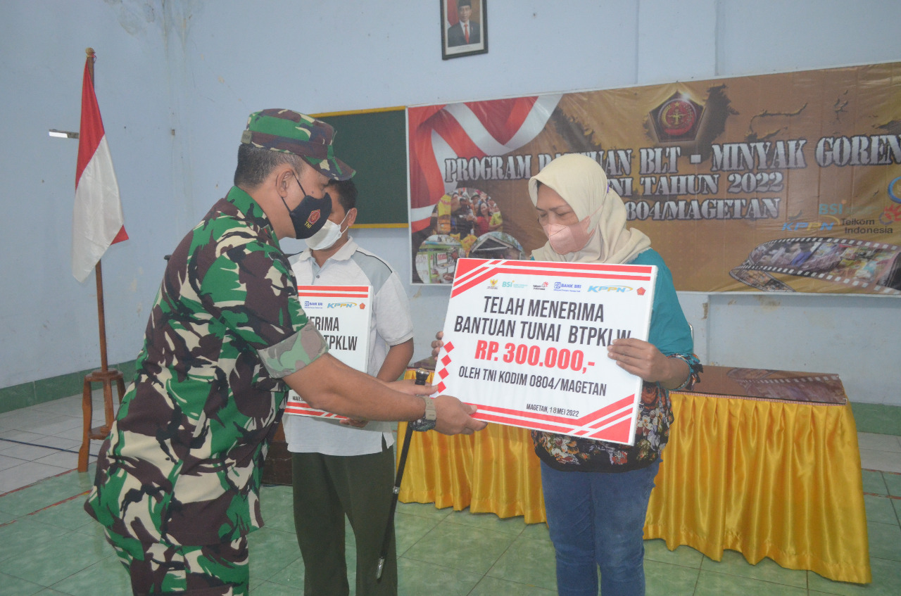 Bantuan langsung tunai minyak goreng (BLT-Minyak Goreng) pemerintah melalui Kodim 0804/Magetan ini diberikan kepada 12 ribu warga penerima manfaat sebesar Rp. 300.000/org yang disalurkan dimulai hari ini oleh Dandim 0804/Magetan dan selanjutnya akan disalurkan pula oleh Koramil jajaran.