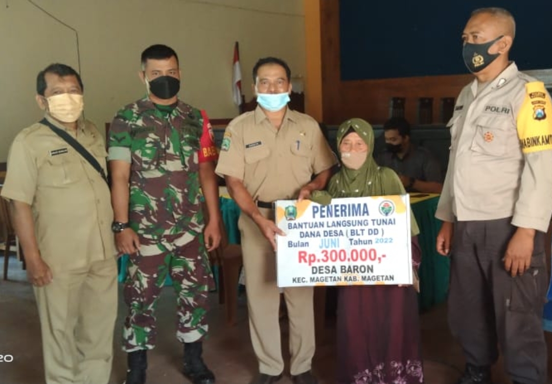 Kegiatan Penyaluran Bantuan Langsung Tunai Dana Desa (BLT DD) untuk bulan Juni 2022 kepada warga Desa Baron dihadiri oleh Kasi PMD Kec. Magetan Eko Susanto, Kasi Trantib Kec. Magetan Agus Susilo, Kades Baron Sunoto, Bhabinkamtibmas Desa Baron Bripka Tumino, Babinsa Baron Serda Nurdiawan, Petugas Bank Jatim Firdaus dan Ibu Widyaningrum, Perangkat Desa Baron dan Warga Desa Baron penerima BLT.