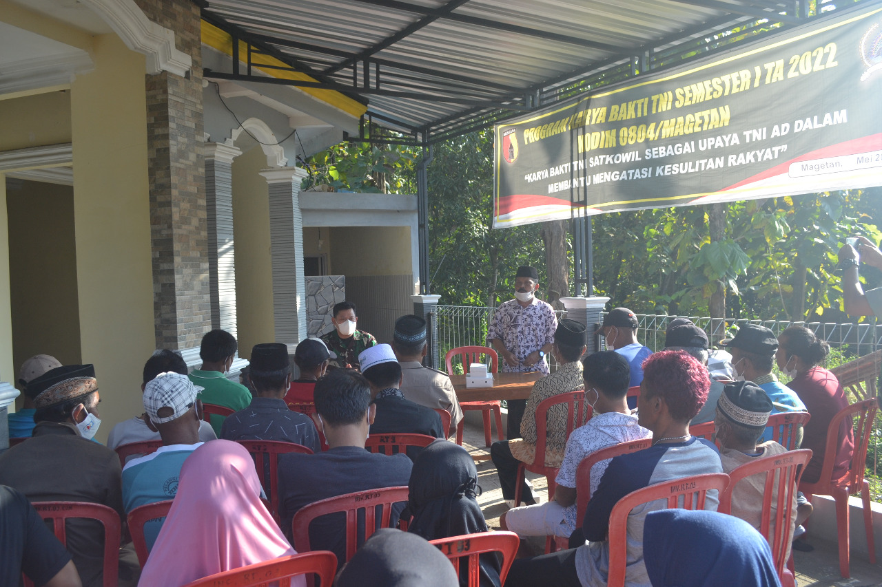 Magetan. Selain Melaksankan kegiatan fisik, giat Program Karya Bakti TNI Satkowil Kodim 0804/Magetan Semester I TA 2022 juga melaksanakan kegiatan non fisik, diantaranya Kodim 0804/Magetan melaksanakan penyuluhan wawasan kebangsaan kepada warga dilokasi karya bakti renovasi Mushola di Dusun Dakutah, Desa Sumber Dukun, Kec. Ngariboyo, Kab. Magetan, Rabu (8/6/2022).