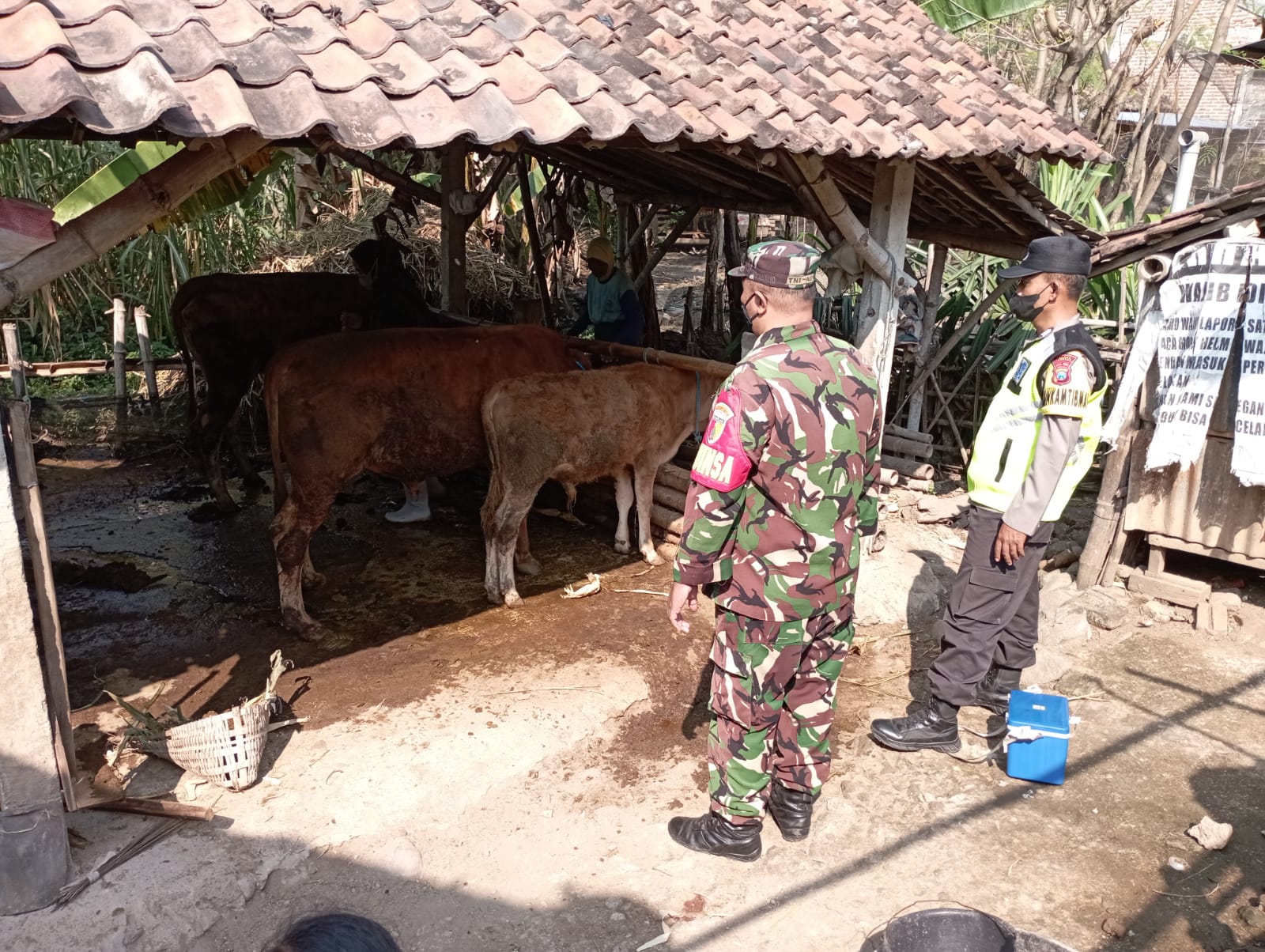 Magetan. Sebagai ujung tombak dalam pembinaan kewilayahan, untuk mengantisipasi penularan Penyakit Mulut dan Kuku (PMK) pada hewan ternak, Babinsa Koramil 0804/10 Kawedanan, Kodim 0804/Magetan Serda Jatmiko bersama Bhabinkamtibmas dan Tim Dinas Peternakan Kab. Magetan melaksanakan pemantauan terhadap hewan ternak sapi di Desa Ngenteb Kecamatan Kawedanan, Kabupaten Magetan, Sabtu (09/07/2022).