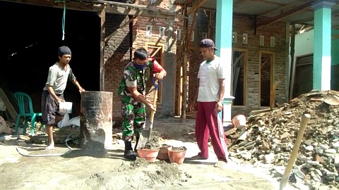 Magetan. Koramil 0804/08 Barat, Kodim 0804/Magetan Sertu Edy Prayitno melaksanakan Kerja bakti memperbaiki rumah di Wilayah Binaannya, Kecamatan Barat, Sabtu (08/04/2023).