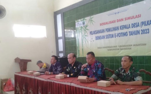 Magetan.kodim-magetan.com – Komandan Koramil 0804/01 Magetan jajaran Kodim 0804/Magetan Kapten Arm Khoirudin diwakili Babinsa desa Ringinagung Serma Nyamin menghadiri pelaksanaan kegiatan Sosialisasi dan Simulasi pelaksanaan pemilihan kepala Desa dengan sistem E Voting tahun 2023 bertempat di Balai desa Ringinagung Kecamatan Magetan. Jumat(09-6-2023)