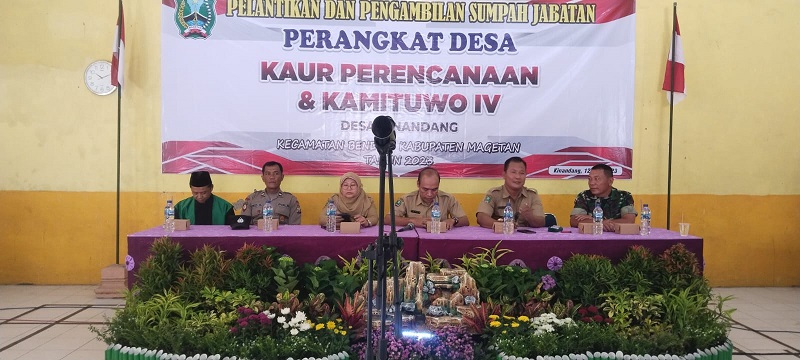 Magetan. Pemerintah Desa Kinandang Kecamatan Bendo Kabupaten Magetan menggelar pelantikan dan pengambilan sumpah jabatan perangkat desa untuk jabatan Kaur Perencanaan dan Kamituwo Dusun 4
