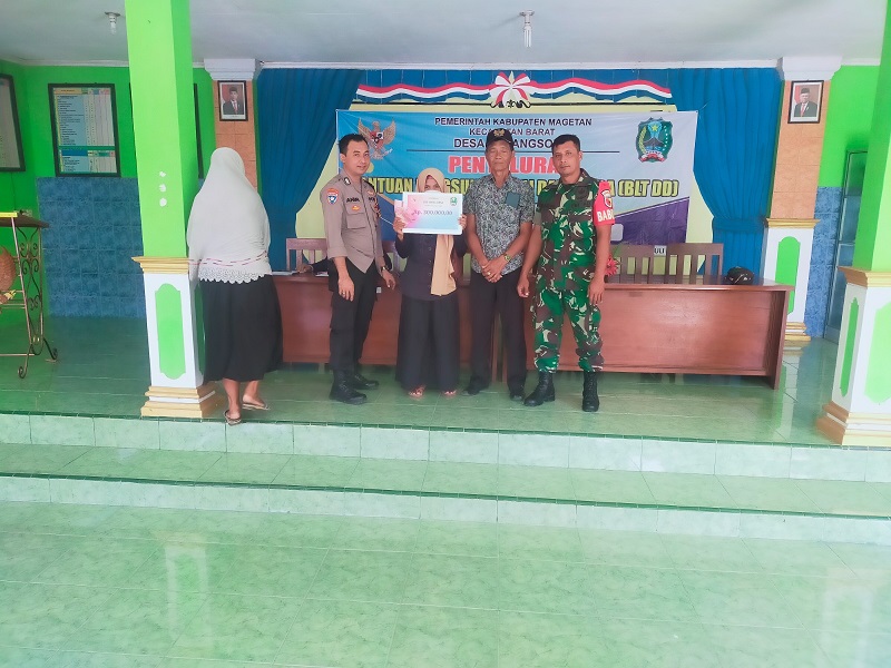 Magetan. Babinsa Koramil 0804/08 Barat Kodim 0804/Magetan Serda Prayitno menghadiri sekaligus monitoring pembagian Bantuan Langsung Tunai Dana Desa (BLT-Desa) periode bulan Juli tahun 2023, di Balai Desa Karangsono, Kecamatan Barat, Kabupaten Magetan, Jumat (14/07/2023).