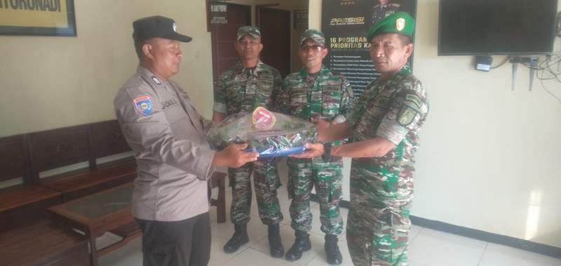Magetan. Peltu RS Nasution selaku Danposramil Nguntoronadi Koramil 0804/11 Takeran Kodim 0804/Magetan bersama anggota mendatangi Mapolsek Nguntoronadi memberikan ucapan selamat HUT Bhayangkara ke 77. Sabtu (01/07/23).