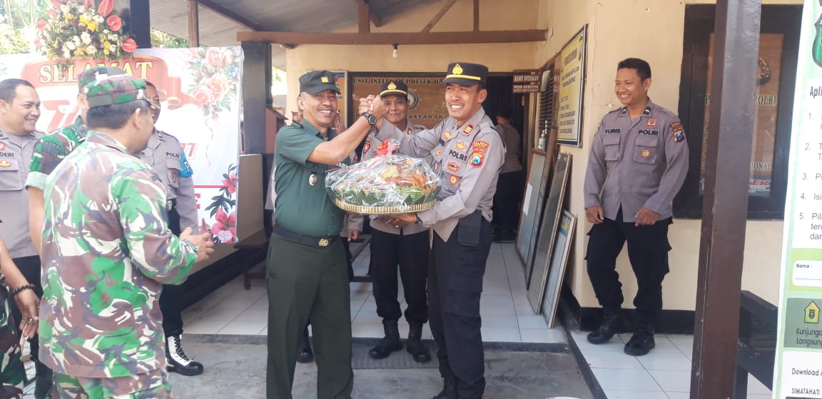 Pemberian ucapan selamat HUT Bhayangkara ke-77 tersebut di sampaikan langsung oleh Danramil Tipe B 0804/08 Barat didampingi anggota Babinsa yang di tandai dengan penyerahan Tumpeng dari Danramil Kapten Arm Agus Hariyono kepada Kapolsek Barat AKP Ruwajianto, S.H, beserta anggota Polsek sebagai tanda syukur terhadap Tuhan Yang Maha Esa. Selain itu Polri juga merupakan mitra kerja serta untuk lebih meningkatkan Sinergitas antara TNI – POLRI.