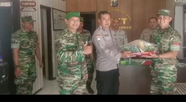 Magetan. Danramil 0804/11 Takeran, Kodim 0804/Magetan Kapten Inf Joko Priyadi bersama anggota mendatangi Kantor Polsek Takeran untuk memberikan ucapan selamat HUT Bayangkara ke-77. (Sabtu 01/07/2023)