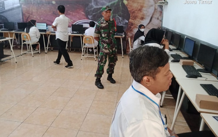Magetan. Babinsa Koramil 0804/08 Barat Kodim 0804/Magetan Desa Karangmojo Serda Jermi melaksanakan pengamanan ujian seleksi perangkat Desa, Desa Karangmojo bertempat diruang praktek Komputer SMKN 1 Kartoharjo, Kecamatan Kartoharjo, Kabupaten Magetan. Senin (14/08/2023)