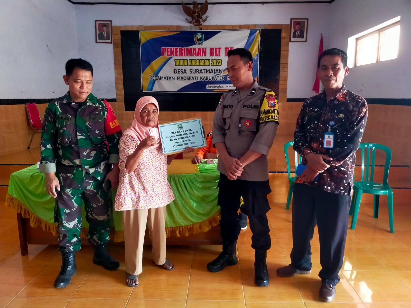 Magetan – Babinsa Desa Suratmajan Serma Amadi Koramil 06/Maospati jajaran Kodim 0804/Magetan memantau sekaligus mendampingi penyaluran BLT DD untuk masyarakat desa Suratmajan kecamatan Maospati yang bertempat di aula Kantor Desa Suratmajan. Jumat (11/8/2023).