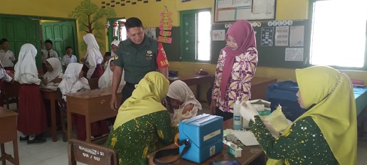 Dalam mendampingi petugas imunisasi menyampaikan dukungannya dalam kegiatan Bulan Imunisasi Anak Sekolah dengan mendampingi petugas yang melaksanakan imunisasi, untuk menghibur serta menenangkan para siswa-siswi SD yang akan di imunisasi agar tidak takut saat di imunisasi.”Tutup Babinsa. (R06)