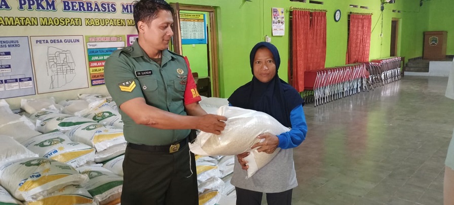 Magetan. Babinsa Desa Gulun Sertu Tri Koramil 0804/06 Maospati jajaran Kodim 0804/Magetan melaksanakan pengawalan pendistribusian bantuan beras yang diselenggarakan oleh Densos Kab Magetan yang Bertempat Dibalai Desa Gulun kec Maospati kab Magetan. Senin (25/9/2023)