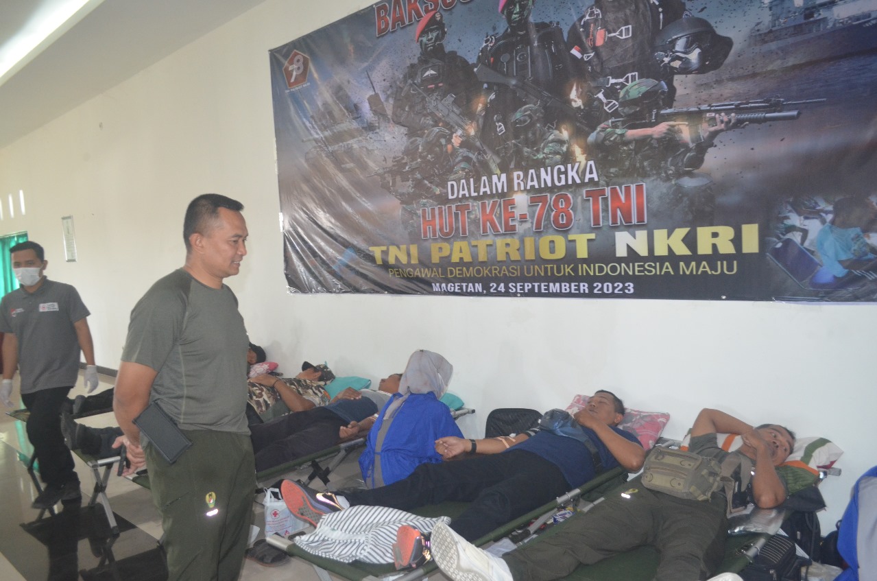 Magetan – Dalam rangka menyambut Hari Ulang Tahun (HUT) TNI ke-78 tahun 2023, Kodim 0804/Magetan bekerjasama dengan Palang Merah Indonesia (PMI) Magetan dan Poskes Magetan menggelar bakti sosial (baksos) kesehatan yaitu donor darah dan pengobatan gratis yang dilaksanakan di Makodim 0804/Magetan. Minggu (24/09/2023)