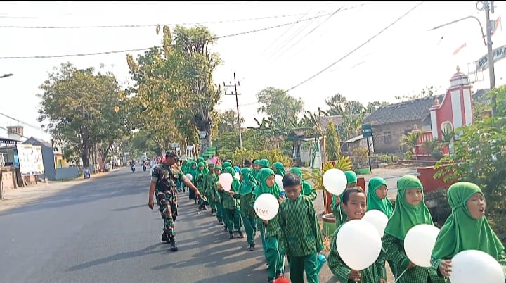 Babinsa melakukan pengawalan pawai keliling Desa Karangsono di mulai dengan pengamanan siswa siswi hingga menbantu mengatur lalulintas.