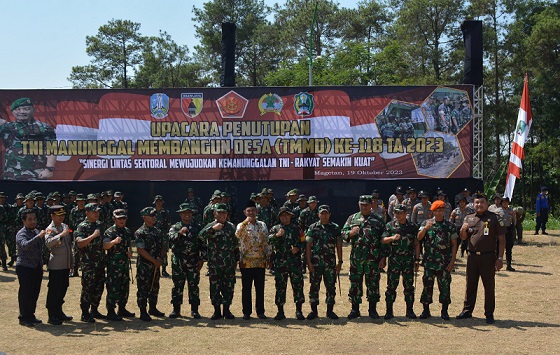 Magetan, Program TNI Manunggal Membangun Desa (TMMD) ke-118 Kodim 0804/Magetan tahun anggaran 2023 secara resmi ditutup. Upacara penutupan dipimpin langsung oleh Kapok Sahli Kodam V/Brawijaya Brigjen TNI Totok Suhartono, S.Sos., bertempat di Bumi Perkemahan Alastuwo Desa Alastuwo, Kecamatan Poncol Kabupaten Magetan , Kamis (19/10/2023).