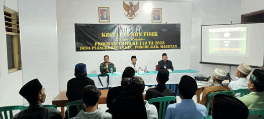 Magetan, Satgas TNI Manunggal Membangun Desa (TMMD) Reguler Ke-118 Tahun 2023, Kodim 0804/Magetan melaksanakan kegiatan non fisik dengan menggelar penyuluhan bahaya terorisme dan paham radikalisme serta Penyuluhan Bahaya Narkoba kepada masyarakat Desa Plangkrongan Kecamatan Poncol, Kabupaten Magetan, Jatim, bertempat di Aula Kantor Desa Plangkrongan, (16/10/2023) malam.