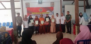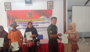 MAGETAN. – Babinsa Koramil 0804/04 Parang serka Suharno bersama dengan Bhabinkamtibmas melaksanakan pendampingan penyerahan sertifikat massal Program Nasional Pendaftaran Tanah Sistematis Lengkap (PTSL) oleh tim Badan Pertanahan Nasional Kabupaten Magetan di Balai Desa Ngunut, Kecamatan Parang, Kabupaten Magetan. Kamis (23/11/2023)