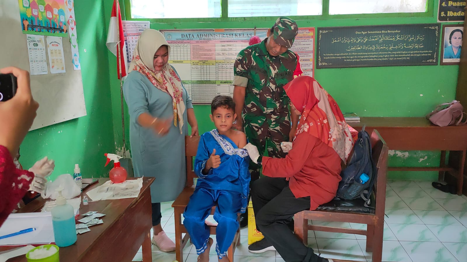 Magetan. Guna mendukung program pemerintah dalam pelaksanaan Bulan Imunisasi Anak Sekolah (BIAS),Serda Maskur Babinsa Desa Tanjung Sepreh Koramil 06/Maospati, Kodim 0804/Magetan melaksanakan pendampingan BIAS di SDN Tanjungsepreh 2 dan MIN 5 Magetan, Kecamatan Maospati, Kabupaten Magetan,Sabtu (4/11/2023).