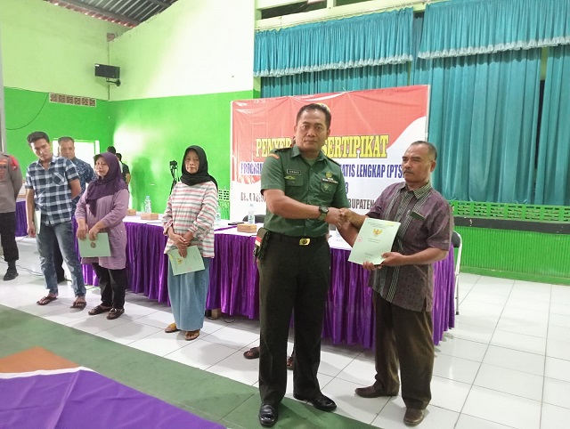 Magetan.- Bertempat di Aula Desa Tulung Kecamatan Kawedanan, Bati Tuud Koramil 0804/10 Kawedanan Pelda Suwanto menghadiri undangan Penyerahan Sertifikat Tanah Pada Program Pendaftaran Tanah Sistematis Lengkap (PTSL) yang di selenggarakan oleh Kementrian Agraria dan Tata Ruang BPN Kabupaten Magetan, pada kamis, (16/11-2023).