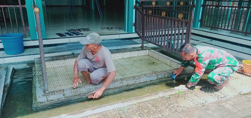 Magetan.- Prajurit TNI memiliki tugas untuk manunggal, membaur dan menyatu dengan masyarakat. Babinsa saat ini punya tugas yang besar, mulai dari bidang pertanian, pemberdayaan, termasuk ikut mendorong masyarakat untuk peduli terhadap lingkungan khususnya peduli terhadap kebersihan tempat ibadah seperti yang dilaksanakan Serda Bowo Aris Wanto Babinsa Desa Temenggungan Pos Ramil/07 Karas Koramil 0804/07 Karangrejo Kodim 0804/Magetan melaksanakan kegiatan gotong royong di Desa Temenggungan Kec. Karas, Kab. Magetan, Rabu (22/11/2023).