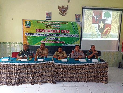 Magetan.kodim-magetan.com – Danramil tipe B 0804/08 Barat Kapten Arm Agus Hariyono bersama Babinsa Desa Bogorejo Serma Triwahyono menghadiri undangan Rapat Penetapan APBDES Tahun Anggaran 2023. Bertempat di Balai Desa Bogorejo, Kecamatan Barat, Kabupaten Magetan. Senin (06/11/2023)