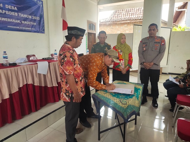 Magetan.- Danramil 0804/10 Kawedanan Kapten Inf Gunawan hadiri Kegiatan Musdes Penetapan Perubahan APBDes Tahun 2023 yang bertempat di Kantor Balai Desa Jambangan,Kecamatan Kawedanan, Kabupaten Magetan, Kamis (23/11/2023).