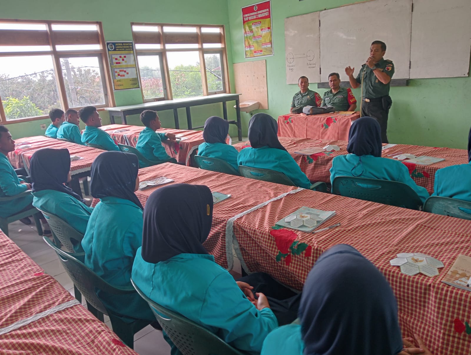 Magetan – Guna menanamkan nilai-nilai pancasila dan menumbuhkan rasa cinta tanah air Bati Wanwil Pelda Suwartoyo Bersama Babinsa Koramil 06/Maospati Kodim 0804/Magetan menyebar pamflet kepada siswa-siswi SMPN 2 Maospati, Magetan. Kamis (16/11/2023)