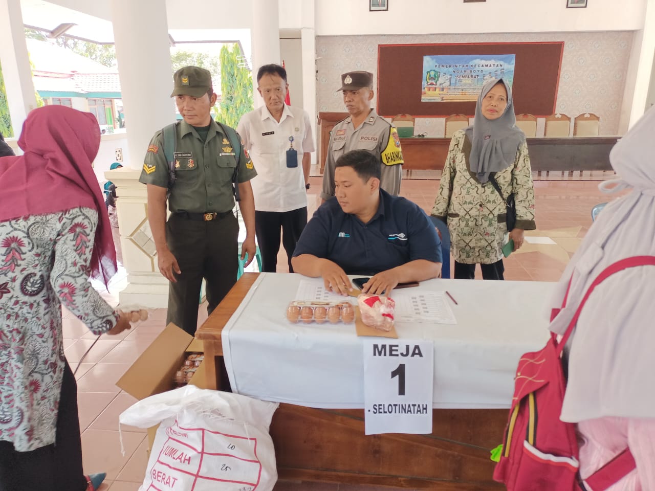 Posramil Ngariboyo 0804/01 Magetan melaksanakan pengamanan penyaluran program pemerintah pembagian bantuan pangan kepada Keluarga Rawan Stunting (KRS). Pengamanan dilaksanakan oleh Babinsa dan Bhabinkamtibmas. Masing-masing Keluarga Rawan Stunting mendapatkan satu paket bantuan sosial pangan berisikan 1 kilogram daging ayam dan 10 butir telur ayam. Bantuan tesebut diberikan kepada masyarakat atau Keluarga Rawan Stunting (KRS) di Pendopo kecamatan Ngariboyo.