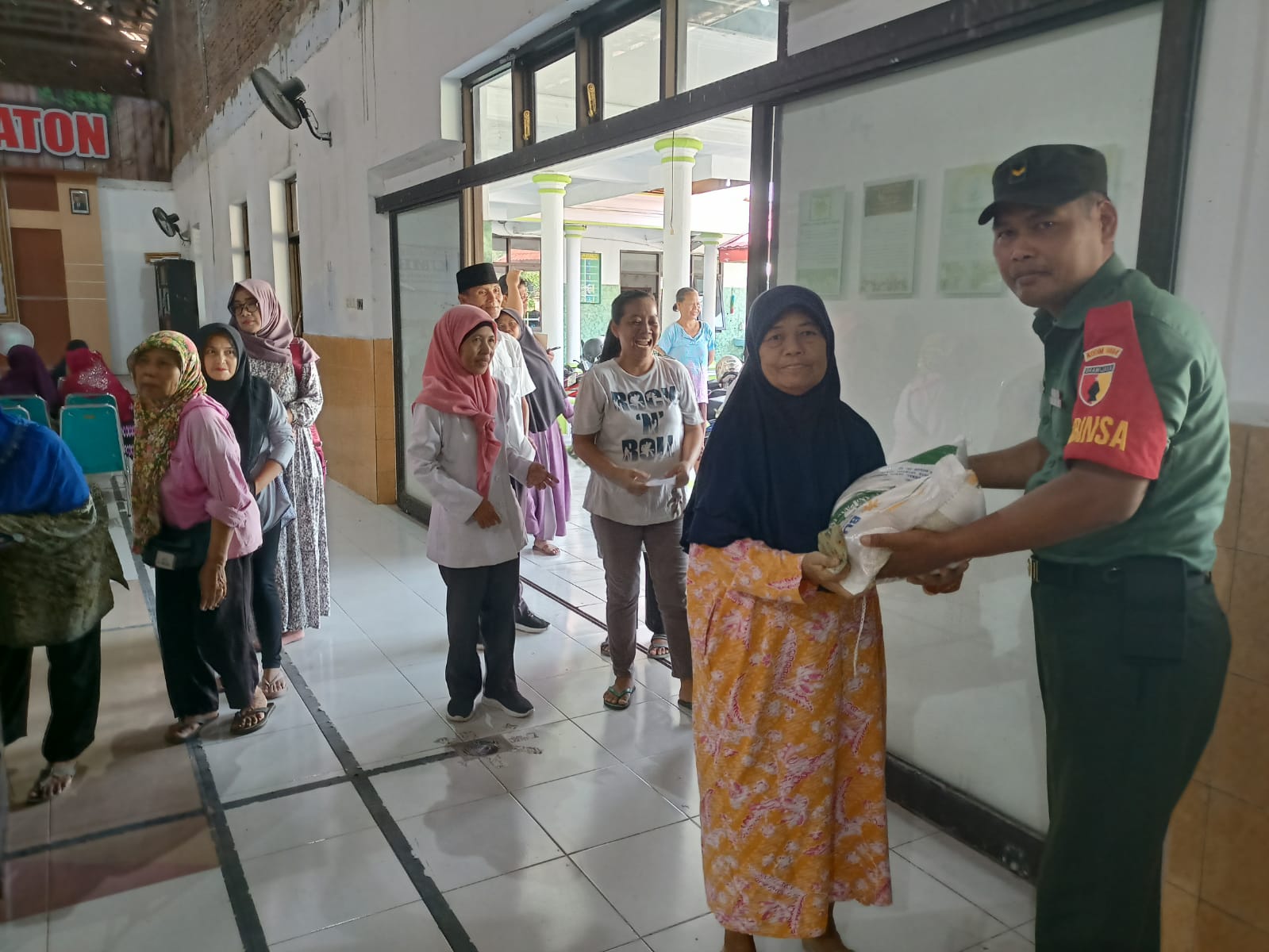 Pembagian beras bantuan pangan berjalan lancar dan tertib. Warga penerima bantuan pangan tampak antusias menerima bantuan tersebut. Pungkas Serda Suyono (R 06)