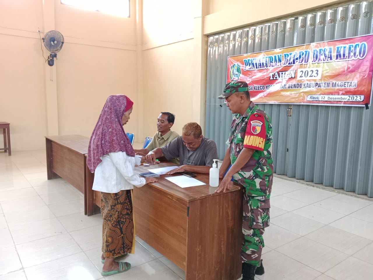 Magetan.kodim-magetan.com – Babinsa Desa Kleco, Koramil Tipe B 0804/13 Bendo jajaran Kodim 0804/Magetan Sertu Sri Suharno Mendampingi Pemerintah Desa binaan menyalurkan Bantuan Langsung Tunai Dana Desa (BLT DD) di Gedung Serbaguna, Desa Kleco, Kecamatan Bendo, Kabupaten Magetan. Selasa (12/12/2023)