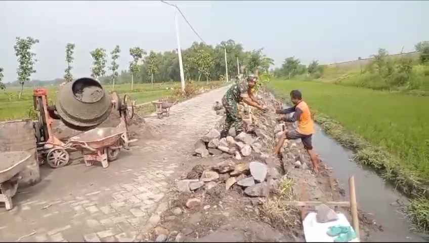 Magetan. Babinsa Koramil 0804/08 Barat Pelda Suwandi bersama warga masyarakat gotong royong membuat saluran irigasi di Kelurahan Tebon, Kecamatan Barat, Kabupaten Magetan. (19/1/2024)