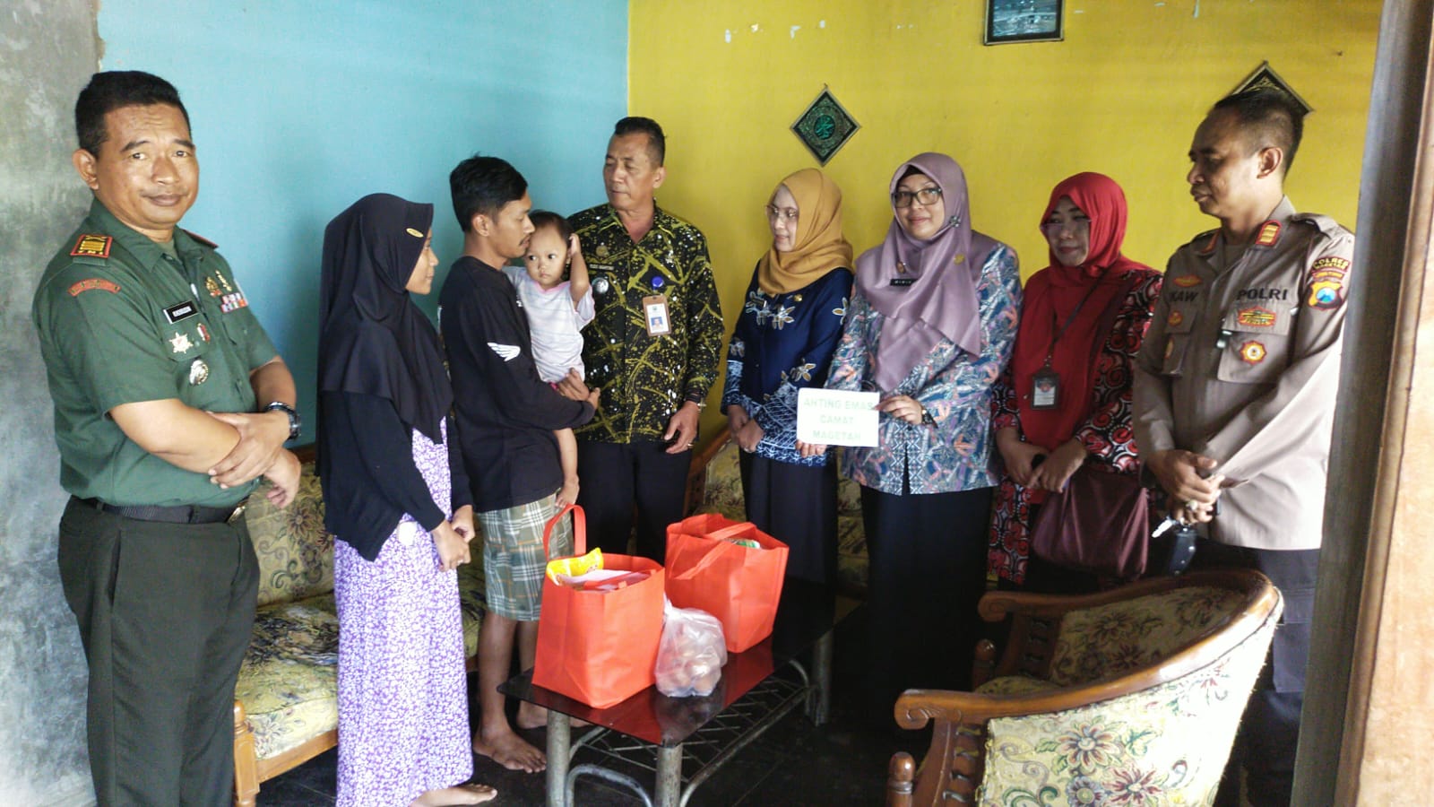 Kegiatan Anting Emas dan Pemberian Bantuan bagi balita Stunting yang diberikan oleh Ir. Hergunadi, M.T (Pj. Bupati Magetan) sebagai orang tua asuh Meisie Kirana Lituhayu dan Bpk. Yudo Wahyono, S.Sos, M.Si. (Camat Magetan) sebagai orang tua asuh Rania Adiba Khanza tersebut dihadiri oleh Kapten Arm Khoirudin (Danramil 0804/01 Magetan), AKP Ika Wardani, S.H (Kapolsek Magetan), dr. Diana (Kepala UPTD Puskesmas Candirejo), Ibu Wiwik Sumaryati, S.T., M.M. (Sekcam Magetan), Koordinator penyuluh lapangan KB Kec. Magetan Ibu Aminatus Solehah, S.Sos, Bpk. Sucipto S.Sos (Kakel. Magetan), Bpk. Safaat Setya Romandon, S.STP, MM (Kakel. Tawanganom), Serka Ponijan (Babinsa Kel. Tawanganom),Serda Deny S (Babinsa Kel. Magetan), Bidan Kel. Magetan dan Kel. Tawanganom, Perangkat Kel. Magetan dan Kel. Tawanganom.