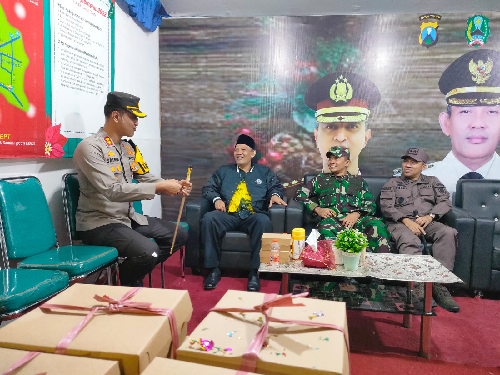 Magetan. Dandim 0804/Magetan Letkol Inf Dani Indrajaya, S.I.P., bersama Forkopimda turun langsung melaksanakan patroli malam menjelang pergantian Tahun 2024. Rombongan berangkat dari Pendopo Surya Graha sekitar pukul 19.00 WIB, Minggu malam (31/12/2023).