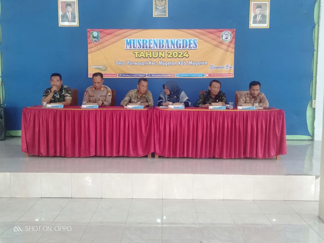 Kegiatan musyawarah rencana pembangunan Desa ( Musrenbangdes ) tahun 2024 dalam rangka penyusunan RKPD tahun 2025 yang di hadiri kurang lebih 50 orang, Camat Magetan Yudo Wahyono, S.Sos, M.M,Sekcam Magetan Ibu Wiwik Sumaryati S.Sos,Danramil Tipe B 0804/01 Magetan Kapten Arm Khoirudin,Kapolsek Magetan AKP Ika Wardani, SH,Kepala desa Purwosari Bpk.Hartono,Ketua BPD Bpk.Ambyah beserta anggotanya,Babinsa desa Purwosari Sertu Mujianto,Bhabinkamtibmas desa Purwosari Aipda Parno,Perangkat desa Purwosari,Ketua Rw dan ketua Rt desa Purwosari,ketua PKK dan anggotanya.