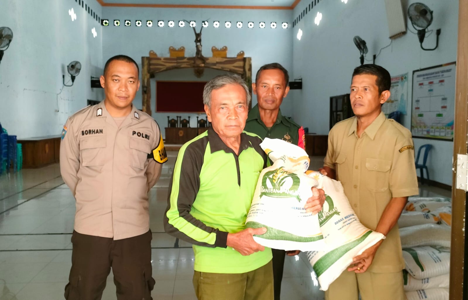 Danramil Tipe B 0804/01 Magetan Kapten Arm Khoirudin juga menuturkan “bahwa kegiatan penyaluran bantuan sosial berupa beras tersebut merupakan program pemerintah dan harus dilakukan pendampingan serta pengawasan dari pihak TNI agar tidak sampai menimbulkan gangguan kamtibmas pada pelaksanaannya.” tutup Danramil(R 01)