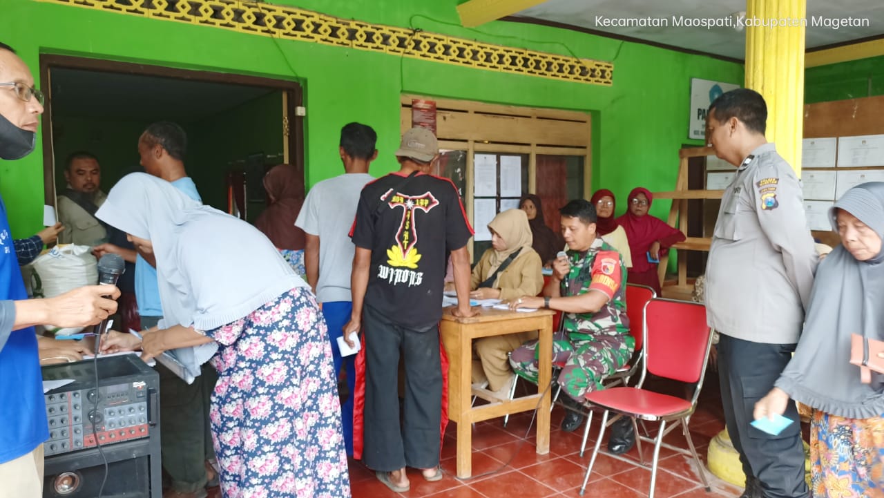 Magetan. – Berikan rasa aman dan nyaman kepada warga penerima bansos, Babinsa Koramil 0804/06 Maospati monitoring dan amankan pembagian bansos serentak sewilayah Kecamatan Maospati, Pembagian bansos yang diperuntukkan bagi masyarakat yang kurang mampu berupa beras kemasan 10 Kg. Rabu (07-02-2024).