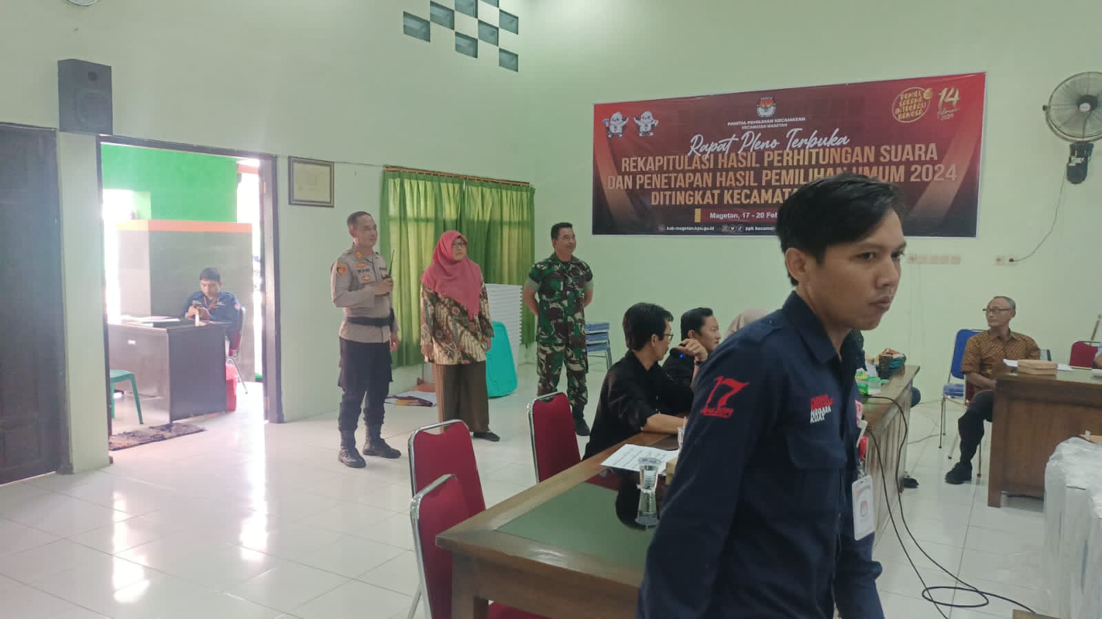 Magetan.kodim-magetan.com – Komandan Koramil Tipe B 0804/01 Magetan jajaran Kodim 0804/Magetan Kapten Arm Khoirudin melaksanakan pemantauan kegiatan penghitungan Rekapitulasi Pemilu tahun 2024 yang dilaksanakan oleh PPK Kecamatan Magetan bertempat di gedung pertemuan Gusti Lider Jln Karya Darma Desa Ringinagung, Kecamatan Magetan, Kabupaten Magetan. Senin(19-2-2024)