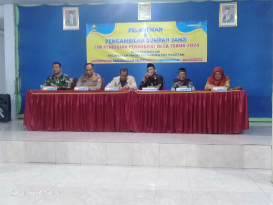 Kegiatan Pelantikan dan pengambilan sumpah tim pengisian perangkat desa (kasi Pemerintahan) desa Purwosari tersebut dihadiri oleh Kepala Dinas PMD Magetan BPK.Puryanto S. I.P, Camat Magetan Bpk. Yudho Wahyono, S.Sos, M.M, Sekcam Magetan Ibu Wiwik Sumaryati ST MM, Danramil 0804/01 Magetan Kapten Arm Khoiruddin, Kapolsek Magetan AKP Ika Wardani, SH, Kepala desa Purwodadi Bpk.Hartono, Bhabinkamtibmas desa Purwosari Aipda Parno, Babinsa desa Purwosari Sertu Mujianto, Ketua BPD dan anggotanya, Perangkat Desa Purwosari, Ketua Panitia Pengisian perangkat desa dan anggotanya, Ketua RW dan RT Desa Purwosari.