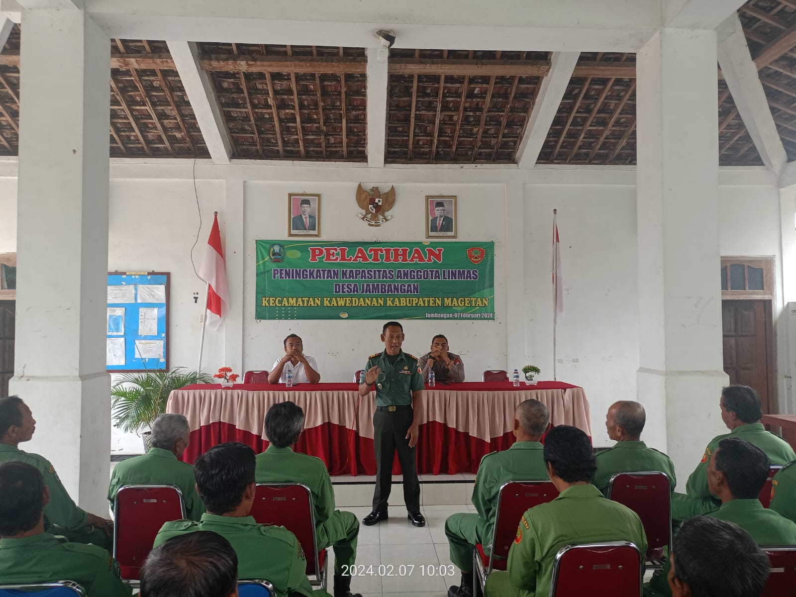 Magetan. – Dalam rangka meningkatkan keamanan dan ketertiban di lingkungan serta menciptakan situasi yang kondusif menjelang kegiatan Pemilu Tahun 2024, Danramil Tipe B 0804/10 Kawedanan Kapten Inf Gunawan bersama Kapolsek Kawedanan Akp Suparminto SH melaksanakan Penyuluhan dan Pelatihan Terhadap Linmas Desa Jambangan Kecamatan Kawedanan, Kabupaten Magetan, Rabu (07-02-2024).