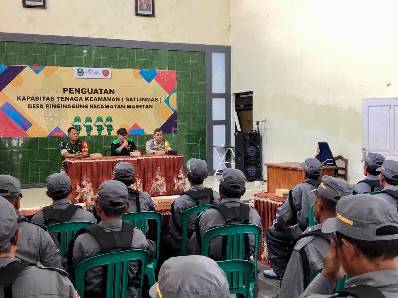Magetan. – Babinsa desa Ringinagung Koramil Tipe B 0804/01 Magetan jajaran Kodim 0804/Magetan Sertu Edi Alroni maksanakan pelatihan penguatan kapasitas tenaga keamanan Satlinmas yang di hadiri 35 orang bertempat di kantor balai Desa Ringinagung Kecamatan Magetan, Kabupaten Magetan.