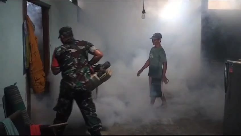 Danramil 08 Barat Kapten Arm Agus Hariyono menjelaskan kegiatan Babinsa Sertu Wawan di wilayah binaannya melakukan cegah dini terhadap penyebaran penyakit demam berdarah dengan penyemprotan fogging.