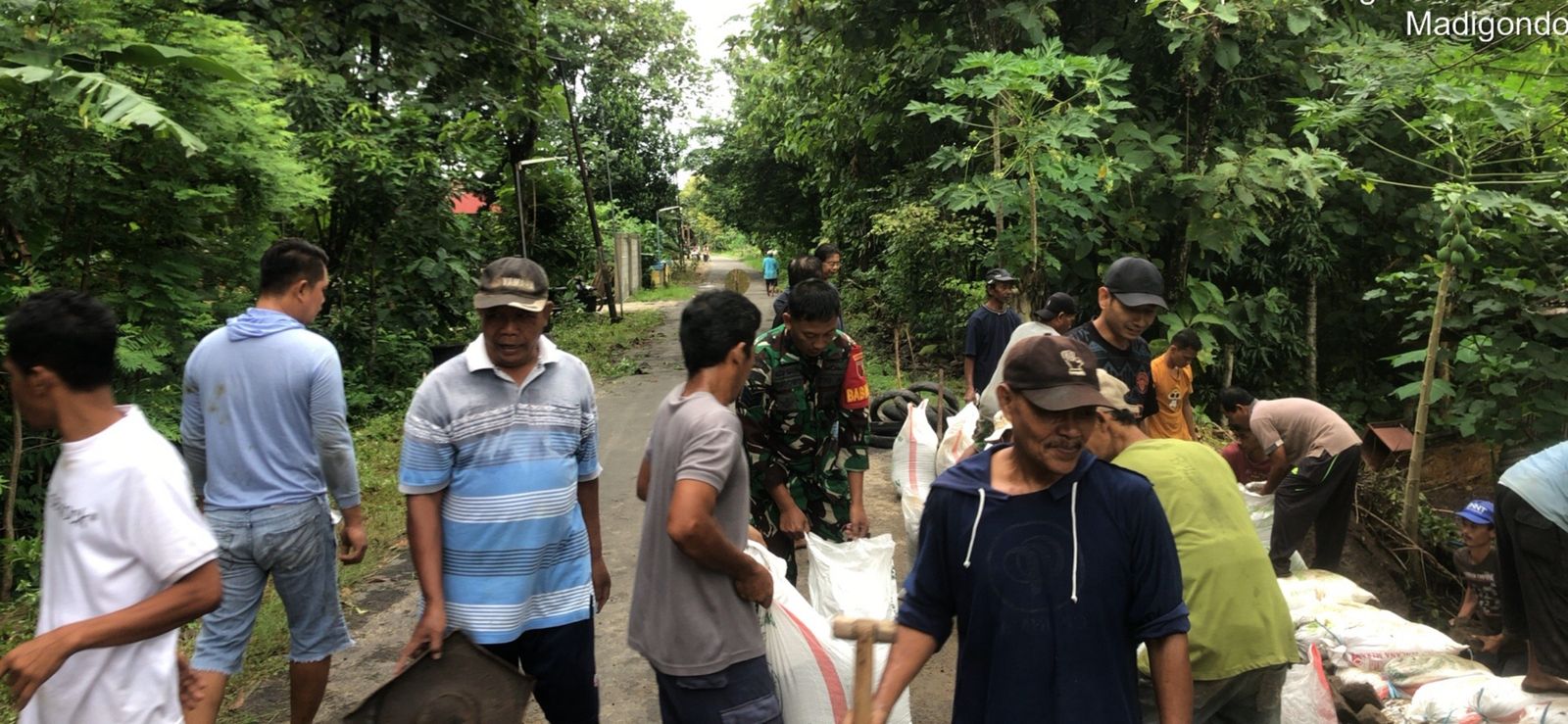 Berbekal alat seadanya, Babinsa Madigondo bersama warga RT 09 Rw. 03 Desa Madigondo mengatasi tanah longsor dengan membuat tumpukan atau mengisi pasir dalam sak untuk menahan atau antisipasi longsor susulan. Peristiwa longsor tersebut diakibatkan oleh hujan lebat yang mengguyur di wilayah Kecamatan Takeran serta dimungkinkan karena kondisi tanah yang labil.