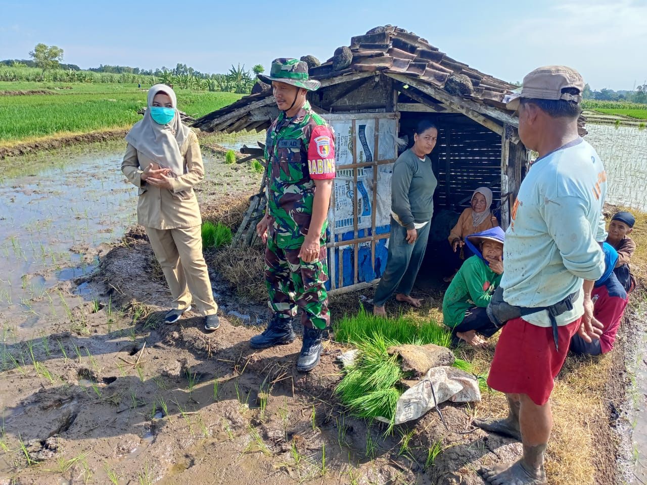 Magetan. Babinsa Kelurahan Tawanganom Koramil Tipe B 0804/01 Magetan jajaran Kodim 0804/Magetan Serka Ponijan bersama Koordinator PPL Kecamatan Magetan melaksanakan kegiatan pemantauan pertumbuhan padi varietas M 70 D usia 2 hari luas 0,5 ha dengan sistem tanam Jajar Legowo bertempat di Lahan milik Bpk. Sudarsono RT. 03 RW. 03 Poktan Tawang Tani kelurahan Tawanganom, Kecamatan Magetan, Kabupaten Magetan. Kamis (25-4-2024)