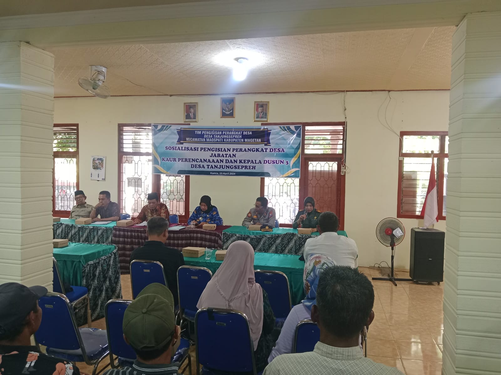Kegiatan sosialisasi pengisian perangkat Desa Tanjungsepreh tersebut dihadiri oleh Camat Maospati Ibu Muryani S.Sos,Danramil Maospati Kapten CBA ( K ) Dyah Nilasari S.Sos,Kapolsek Kompol Sumantri SH,Kades Tanjungsepreh BPK H.Parno,Ketua RT dan RW,Ketua BPD,Tiga,TOMAS dan warga masyarakat desa Tanjungsepreh.