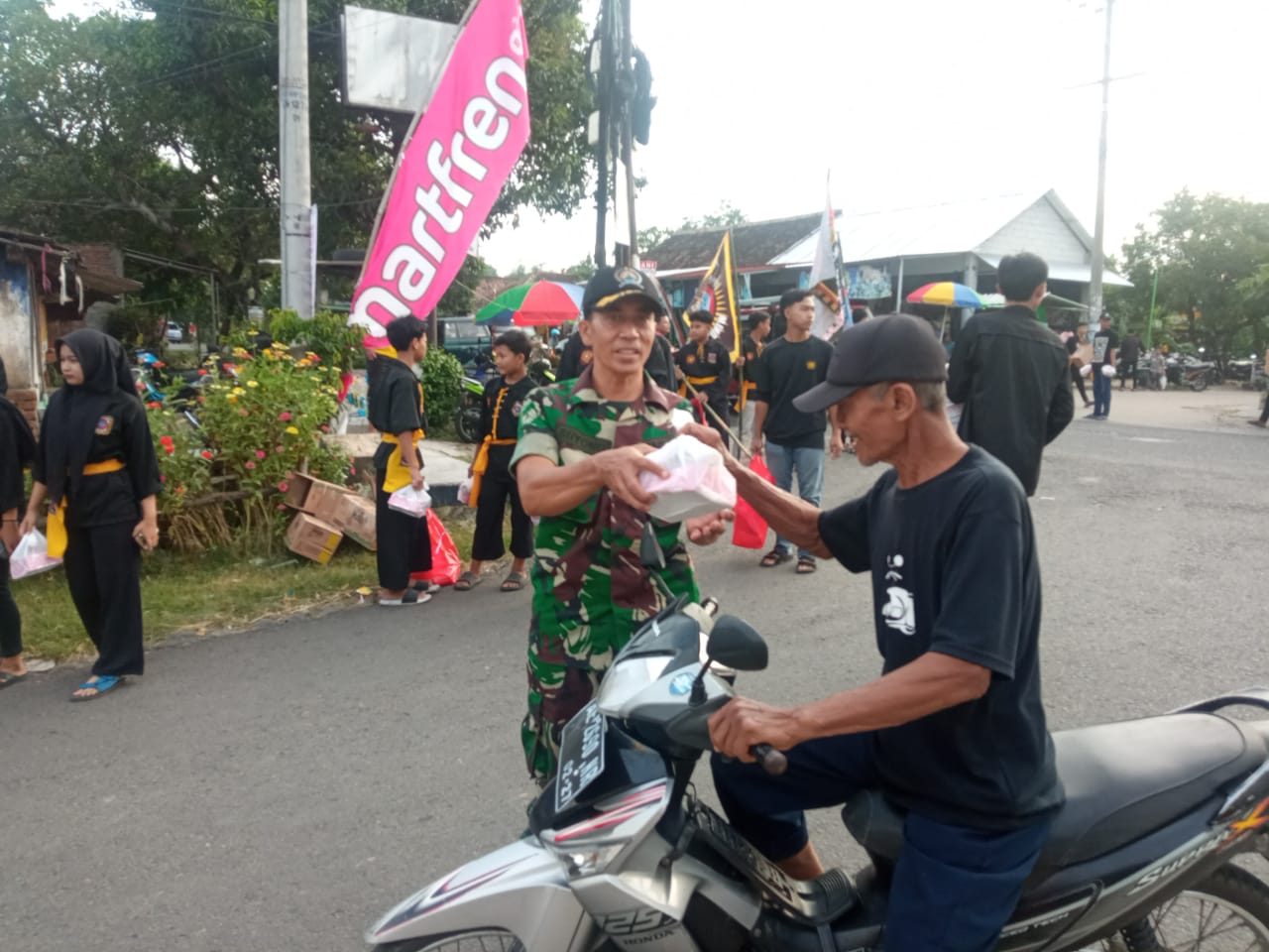 Jelang mendekati waktu buka puasa,Babinsa Koramil Tipe B 0804/13 Bendo besama warga PSHT dan PSHW secara sukarela membagikan takjil gratis kepada setiap pengguna jalan yang melintas di depan pasar Dremo kecamatan Bendo Kabupaten Magetan.