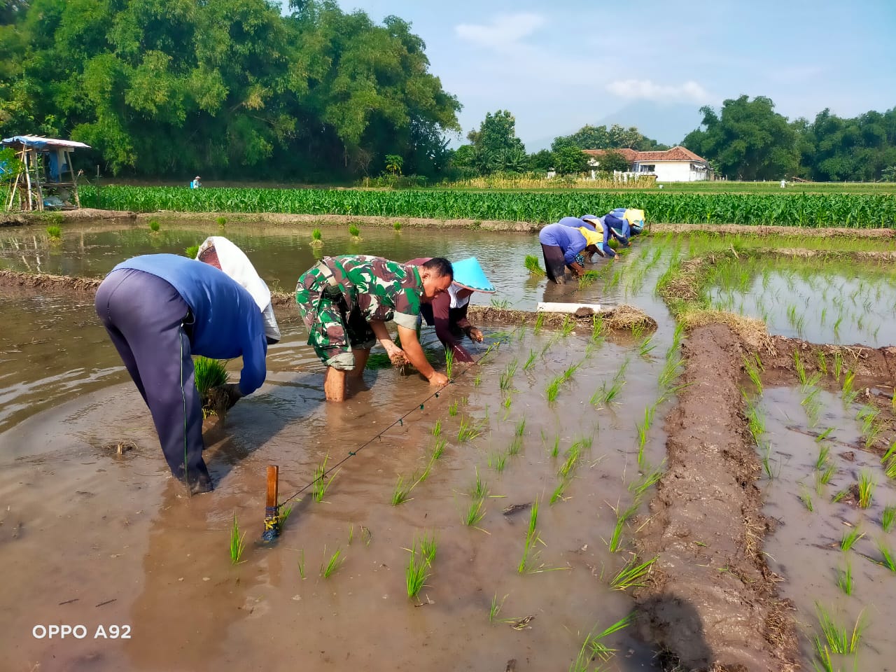 Dengan penuh semangat Babinsa juga mendorong semangat para petani dalam melakukan penanaman padi, mulai dari penyemaian bibit, pengolahan lahan sawah, perawatan sampai panen padi. Seperti saat ini yang sedang mereka lakukan ialah menanam padi di sawah milik Bapak Gutoyo.