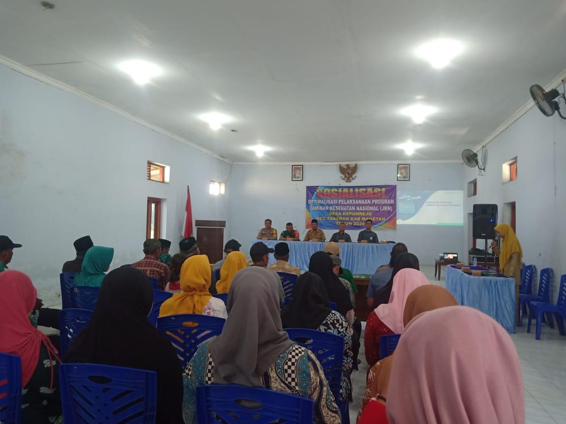 Magetan. – Babinsa Koramil Tipe B 0804/11 Takeran jajaran Kodim 0804/Magetan, menghadiri acara Sosialisasi Optimalisasi Program Jaminan Kesehatan Nasional (JKN) dari Badan Penyelenggara Jaminan Sosial (BPJS) Ta. 2024 bertempat di Aula Desa Kepuh Rejo, Kecamatan Takeran, Kabupaten Magetan. Senin (6/5/2024).