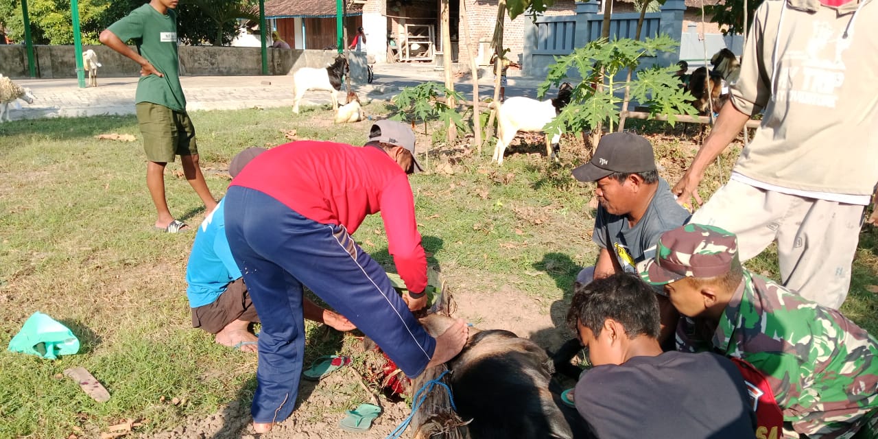 “Salah satu tugas yang kami laksanakan ikut serta berperan aktif memberikan pendampingan dan membantu pelaksanaan penyembelihan hewan kurban, hingga pelaksanaan pembagian daging secara langsung kepada warga masyarakat yang berhak menerimanya,” jelas babinsa
